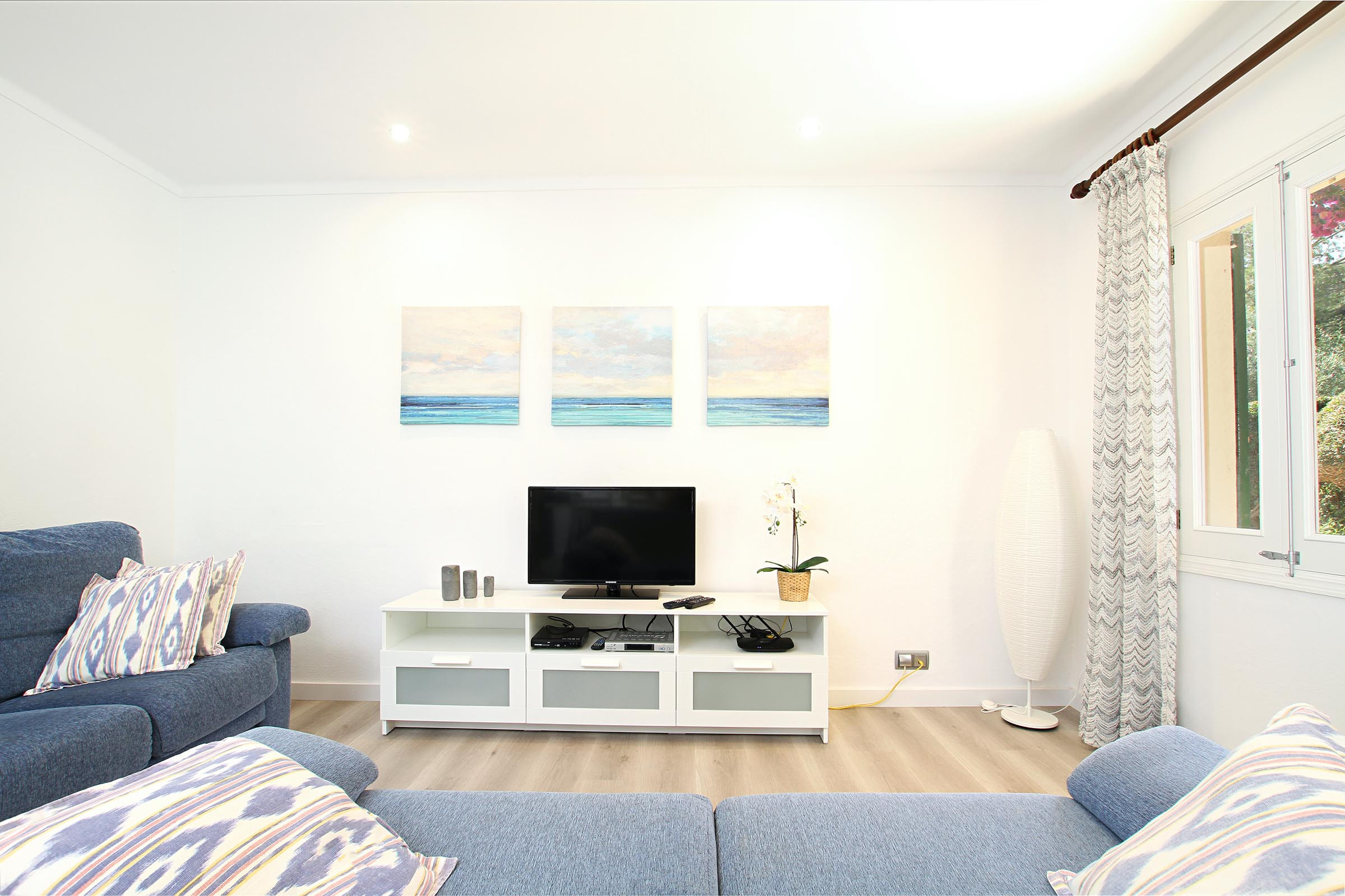 En el interior, la vivienda es de estilo tradicional mallorquín, con muebles de madera y platos españoles en la pared. La decoración es blanca y las baldosas del suelo son de terracota. Con tres dormitorios, la villa pude albergar un máximo de seis personas.